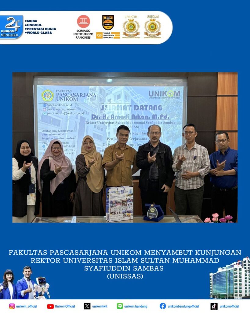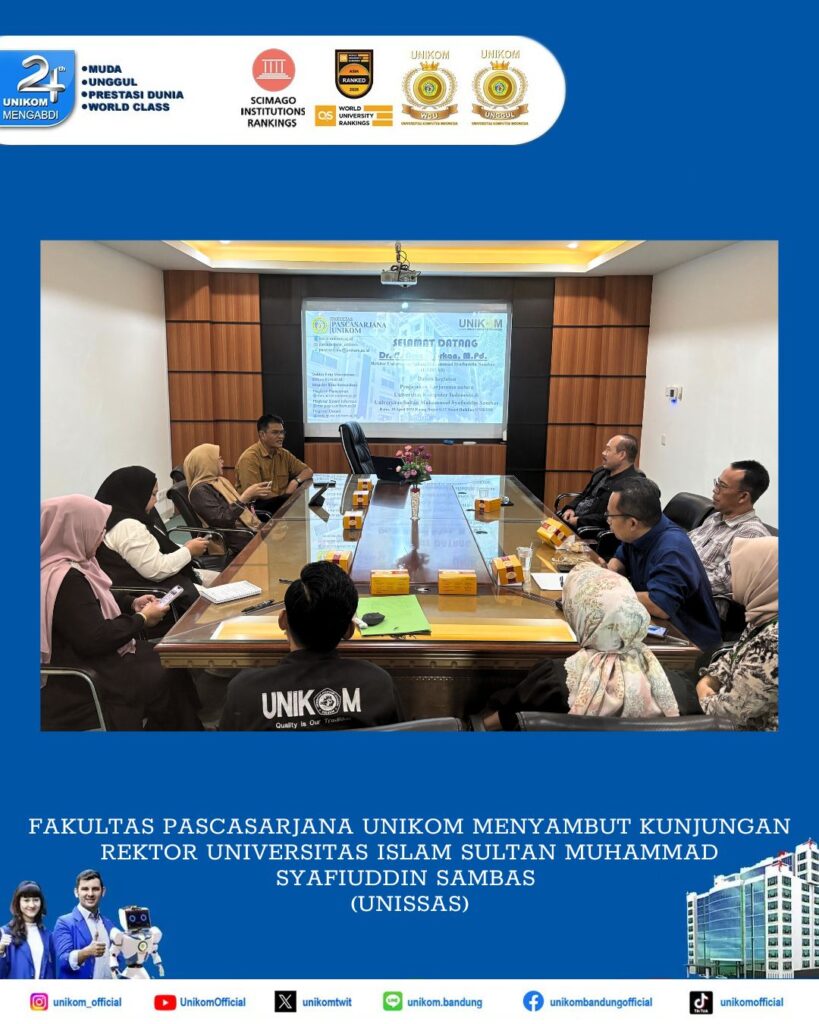 Bandung, UNIKOM – Fakultas Pascasarjana Universitas Komputer Indonesia (UNIKOM) diwakili Dekan Fakultas Pascasarjana UNIKOM, Assoc. Prof. Dr. Rahma Wahdiniwaty, Dra., M.Si., beserta jajaranya menyambut hangat kunjungan Rektor Universitas Islam Sultan Muhammad Syafiuddin Sambas (UNISSAS), Dr. H. Arnadi, M.Pd., pada hari Rabu, 30 April 2025 bertempat di Lt 12 ruang 12.012 Gedung Smart Building UNIKOM. Kunjungan ini dalam rangka penjajakan kerjasama antar Perguruan Tinggi, diantaranya rencana studi lanjut program Magister beberapa staff UNISSAS ke Program Studi Magister Desain, Magister Sistem Informasi dan Magister Ilmu Komunikasi Fakultas Pascasarjana UNIKOM