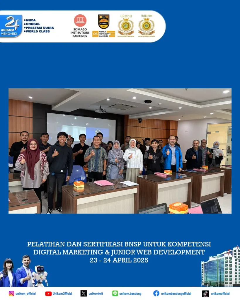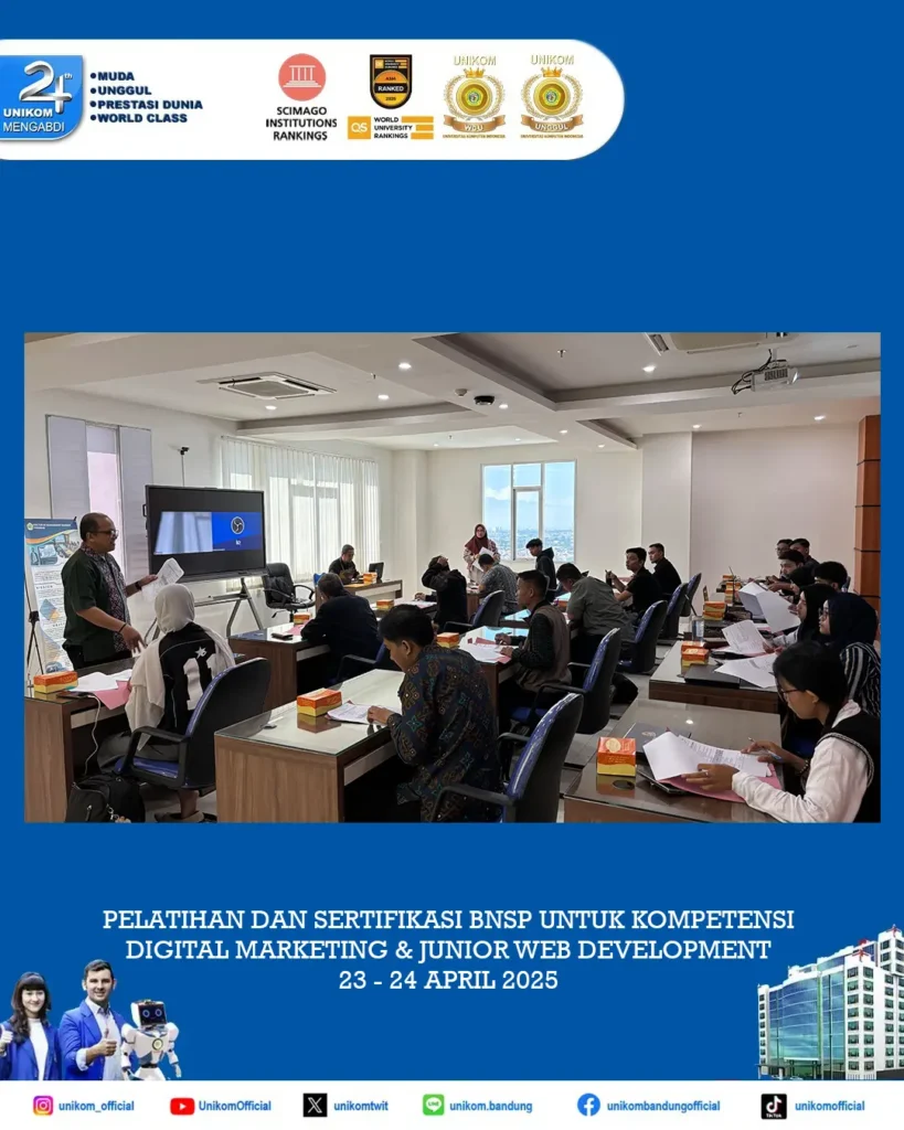 Bandung, UNIKOM – QIA Solution bersama Dinas Tenaga Kerja Provinsi Jawa Barat (Disnaker Jabar) dan BNSP (Badan Nasional Sertifikasi Profesi) bekerjasama dengan Fakultas Pascasarjana dan Direktorat AP2SC UNIKOM mengadakan Pelatihan dan Sertifikasi BNSP secara FREE (GRATIS) untuk uji kompetensi Digital Marketing dan Junior Web Developer. Acara ini dilaksanakan selama 2 (dua) hari pada tanggal 23 – 24 April 2025 bertempat di Kampus Smart Building UNIKOM Lt 11 dan 12 diikuti peserta dari UNIKOM dan umum dengan jumlah peserta sebanyak 120 orang. Adapun peserta dari UNIKOM terdiri dari Mahasiswa, Dosen dan Tendik Fakultas Pascasarjana UNIKOM, Staff Direktorat AP2SC UNIKOM dan Dosen dan Mahasiswa Program Studi Manajemen Fakultas Ekonomi dan Bisnis UNIKOM.