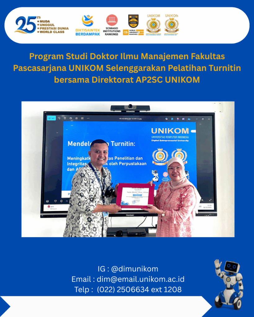 Program Studi Doktor Ilmu Manajemen Fakultas Pascasarjana menyelenggarakan kegiatan Pelatihan Turnitin bekerja sama dengan Direktorat AP2SC (Aplikasi Pengembangan & Pelatihan Service Center) UNIKOM pada Sabtu, 6 Desember 2026.